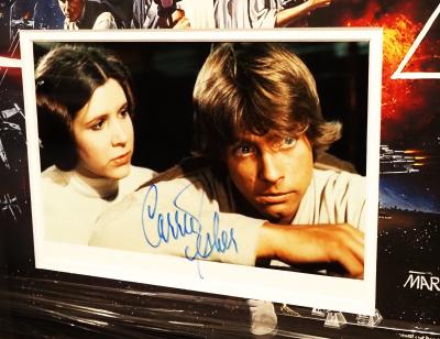 Very nice signature, hand signed by the sadly deceased actress Carrie Fisher [1956-2016] who played the role of Princess Leia in the Star Wars franchise of movies, first appearing in the original three movie in 1977. Carrie reprised the role again in the follow-ups ending with The Rise of Skywalker in 2019 using unseen footage from a previos movie. A very sought after signature which has been framed to a size of 20 x 24 ins.