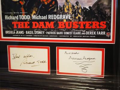 A very nice double signed display from Richard Todd & Michael Redgrave with an added 10 x 8 photo, stars of the 1955 British classic The Dambusters. Richard & Michael had the principle roles of Barnes Wallace & Wing Commander Guy Gibson.The stort surrounded the development of Barnes Wallace's bouncing bomb, developed in the hope of crippling the the Möhne, Eder, and Sorpe dams & destroying Gremany's heavy industry. Overall size 40x41 cms