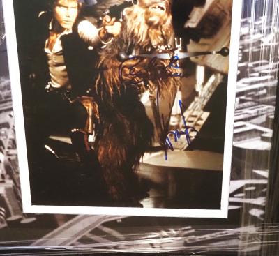 A very unusual & quite scarce Harrison Ford & Peter Mayhew double signed Star Wars 10 x 8 inch photo. This superb photo shows Harrison & Peter in their iconic S Wars roles of Han Solo & Chewbacca obviously fighting of the Stormtroopers in a battle scene. Harrison Ford has always been a very sought after signature either for the Star Wars saga or his equally famous role of Indiana Jones. This rather special items measures 20 x 24 ins with the printed mount board design.
