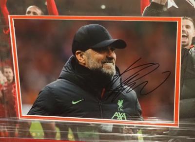 Superb 12 x 8 inch [A4] photo hand signed by former Liverpool FC manager Jurgen Klopp. Jurgen joined Liverpool in 2015 & has brought great success back to the club winning the Premier League in 2019 as well as the Champions League that same year. If you include the EFL Cup and FA Cup in 2022 to his record it makes him one of the clubs most successfull managers of all-time. Sadly for The Kopp faithfull Jurgen has decided to call it a day at the club & this will be his final year. Superbly framed in red with a mount board design with an overall measurement of 20 x 24 ins.