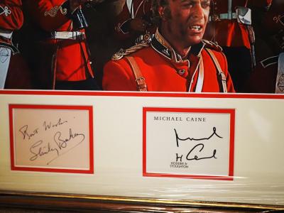 Superb "Zulu" double hand signed display from two of the country's leading actors, Stanley Baker & Michael Caine. The two signatures are framed to a "Zulu" display the 1964 classic about the defence at Rorkes Drift during The Zulu Wars. Superb item for the movie fan with the large 10 x 16 ins showing the leading men at the battle. Framed in wood to a white & red mount to a size of 46 x 57 cms.