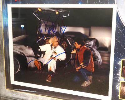 Super double signed [scarce] Back to the Future 10 x 8 photo hand signed by cast members Michael J Fox & Christopher Lloyd. Not signed in Dallas at the 40th anniversary 2025 but at a previous meeting a few years back possibly San Diago ?? [my memory ain't what it was folks] The first airing of the movie was 1985 with a few later follow-ups & the series has quite rightly gained a cult classic status & still proves as popular today as it was back in the 1980s. This is a pretty scarce item & although i've had double signed items before but never on a 10 x 8 inch photo. The item is set off perfectly with a custom design to a size of 20 x 24 ins overall.