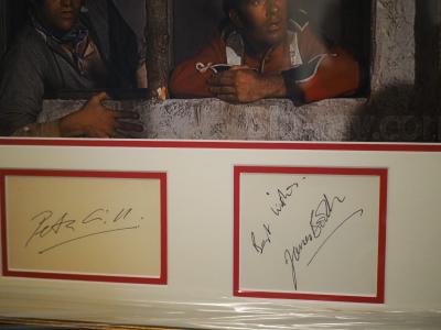 Two very nice album pages hand signed by Peter Gill & James Booth who both starred in the 1964 movie classic. Gill played the part of Private 612 Williams & Booth as Private Henry Hook, both were awarded the VC for their actions, Peter Gill is a quite scarce signature & James Booth's signature is always popular. Mounted in red & white to a brown wood frame. Overall size is 41 x 56 cms