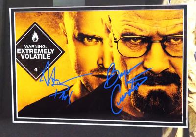 Super scarce item signatures from both Aaron Paul & Bryan Cranston. Aaron & Bryan were the main protagonists in the ground breaking series Breaking Bad which ran with great success for a full five series totaling sixty two episodes. This was signed at a private signing in the USA & Bryan has apparently decidiedhe is not doing more. I've had Bryan's signature before on signed cards, never to a photo. Superbly framed with a design exclusive to us. Scarce item.
