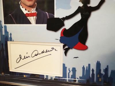 Super large album book page hand signed by English actress Julie Andrews. This super designed piece shows Julie in the Disney classic from 1964 Mary Poppins. This classic movie was the highest-grossing film of 1964 & Julie's feature film debut. The Acadamy Award winning movie was filmed entirely at the Walt Disney Studios in Burbank California, using painted London background scenes. Julie later went on to great movie success with hits such as The Sound of Music & Thoroughly Modern Millie. The hand designed mount board & frame measures 20 x 24 ins in total.