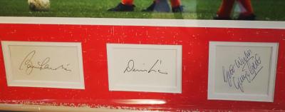 Three stunning autographs on album pages hand signed by some of Manchester Uniteds greatest players George Best, Bobby Charlton & Denis Law, all on one superb framed display. Added to the signatures is a gorgeous large photo which shows the European Cup winners in the Man Utd home strip of red & white. With "The Holy Trinity" superbly printed into the mount, this large item at 64 x 43 cms is a must for any Manchester United fan. With the price of the individual signatures rising considerably this makes a great display piece.