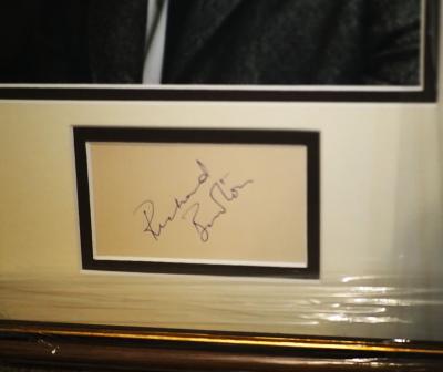 Very nice,clear album book page hand signed by Welsh actor Richard Burton. Born in 1925 Shakespearean actor Richard also starred in over 40 movies inc The Robe & Look Back in Anger and is also remembered for his love affair and tempestuous marriages to the beauty Elizabeth Taylor. Gorgeous item for the fan and superbly framed in dark wood with an added 10 x 8 inch photograph.Overall size 57 x 34 cms