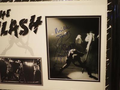 A superb & very iconic photo hand signed by The Clash duoPaul Simonon & Mick Jones.. This superb 12 x 8 inch photo of Paul smashing his guitar on stage at the New York’s Palladium in 1979 is one of rocks most iconic photographs and the guitar incidentaly is on display at the Museum of London. Paul met Mick Jones and formed the clash in 1976 along with Joe Stummer & had such hits as "Rock the Casbah" & "The Guns of Brixton". This piece with printed mount board measures an impressive 20 x 24 ins in total.